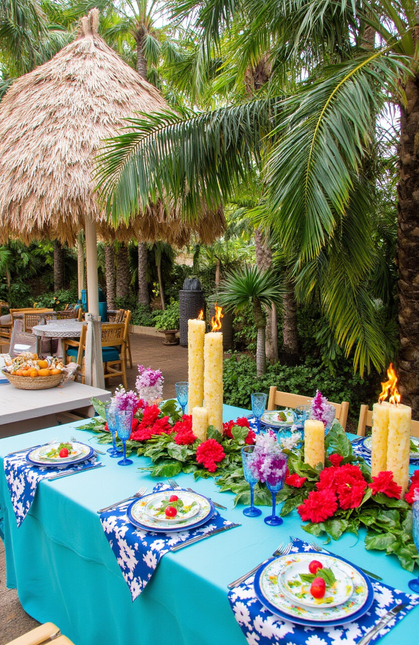 Bring the tropics to your backyard with vibrant colors and lush greenery. Use palm leaves, bright flowers, and bamboo furniture for an exotic feel. Tiki torches and a thatched umbrella complete the tropical vibe.