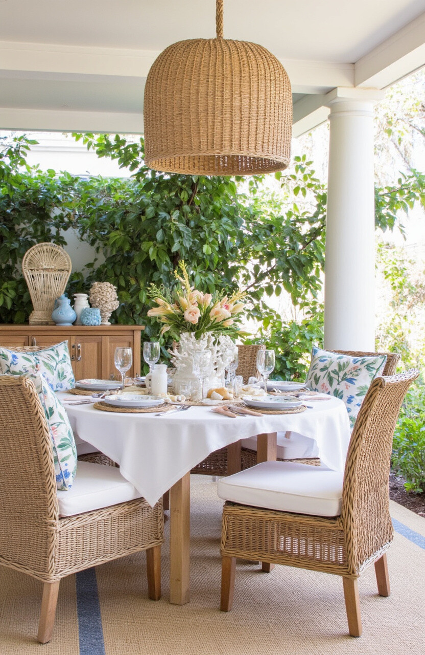 Create a beach-inspired dining space with sand-colored tones and natural textures. Use wicker furniture and driftwood accents for a relaxed, coastal vibe. Shells and coral make great decorative pieces.