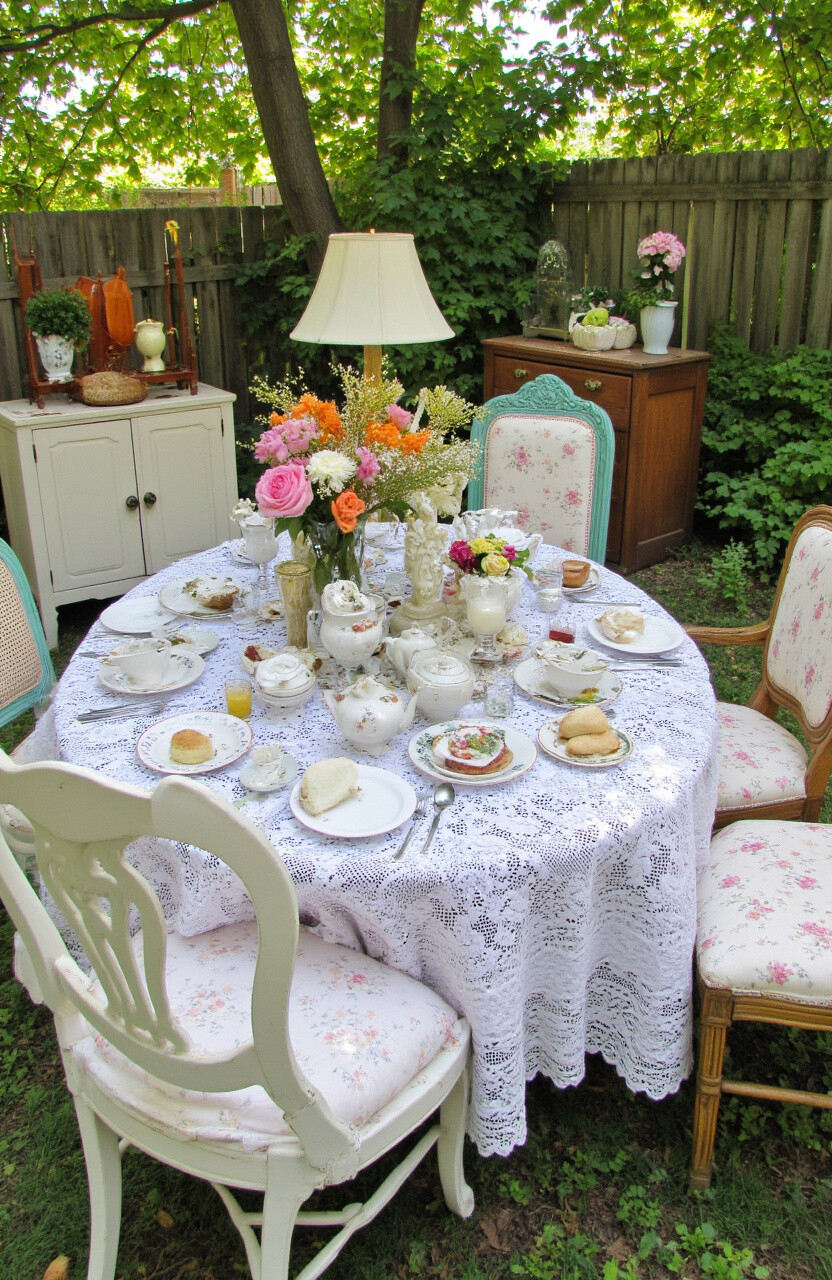 Transport yourself to a bygone era with a vintage tea party setting. Use delicate china, lace tablecloths, and floral arrangements to create a quaint ambiance. A mix of antique and thrifted furniture adds character.