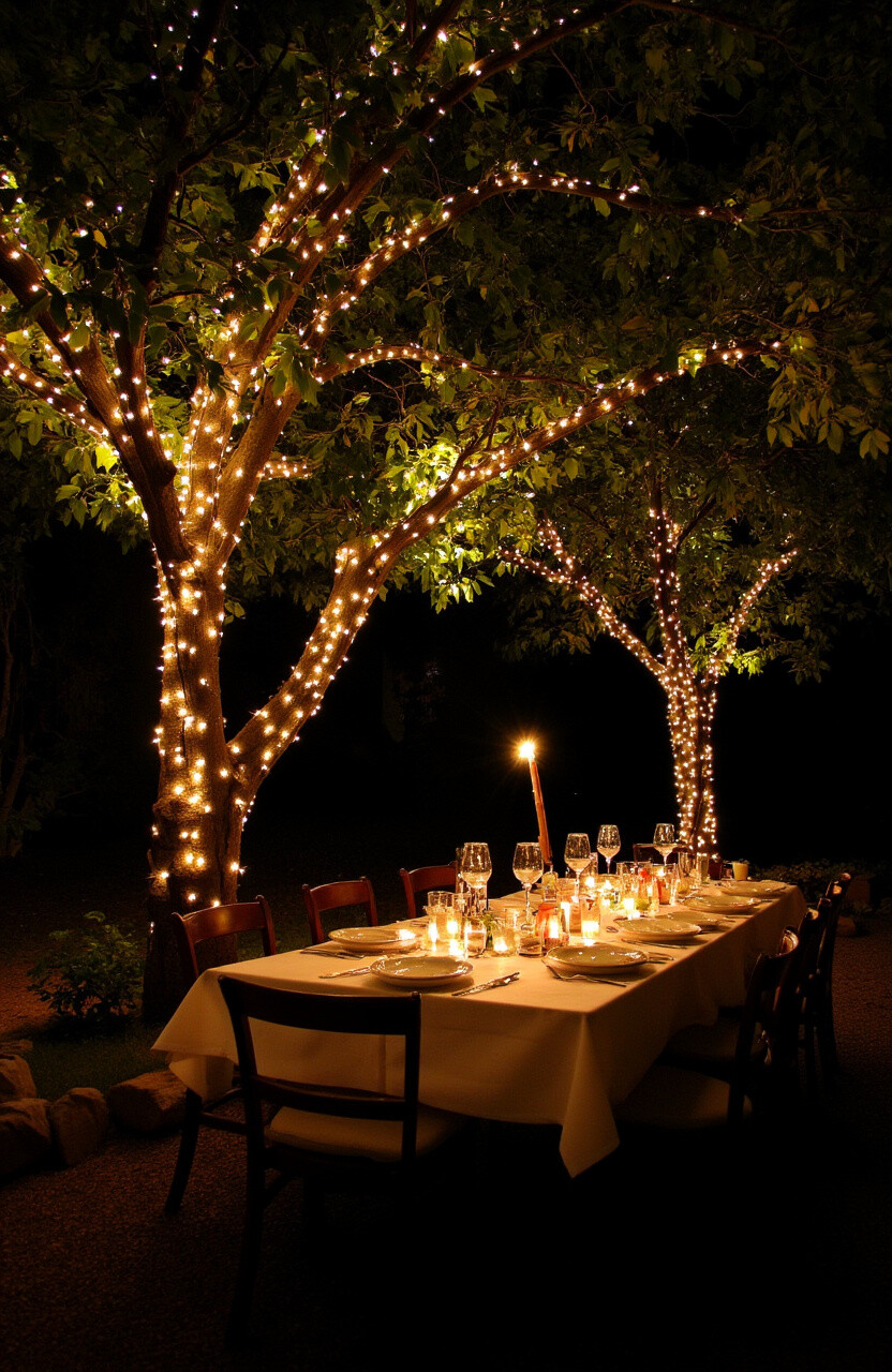 Twinkling fairy lights can transform your garden into a magical dining wonderland. String them up around trees or across your dining area for a soft, glowing ambiance. The gentle light is not only romantic but also highlights the natural beauty of your garden.