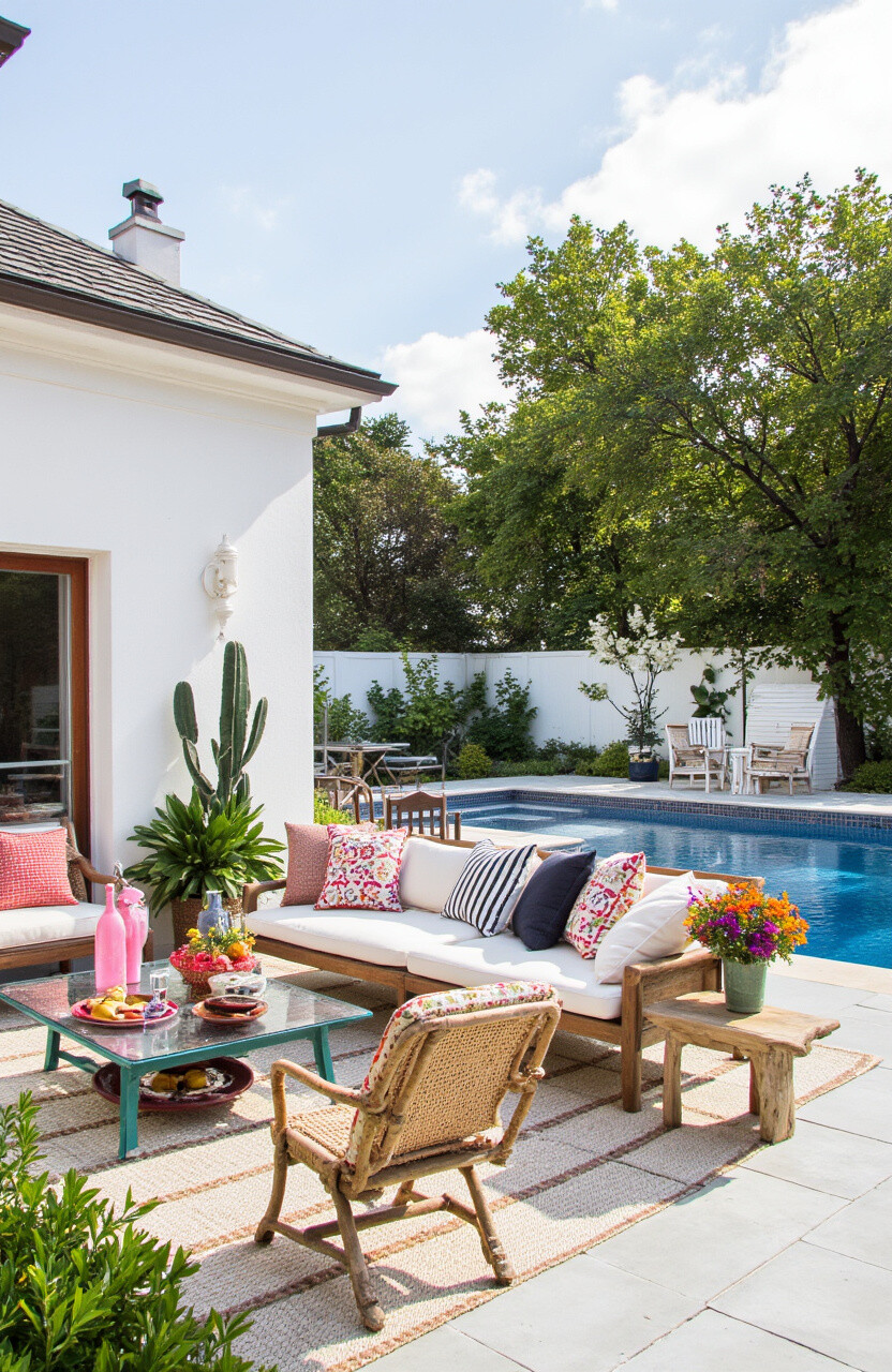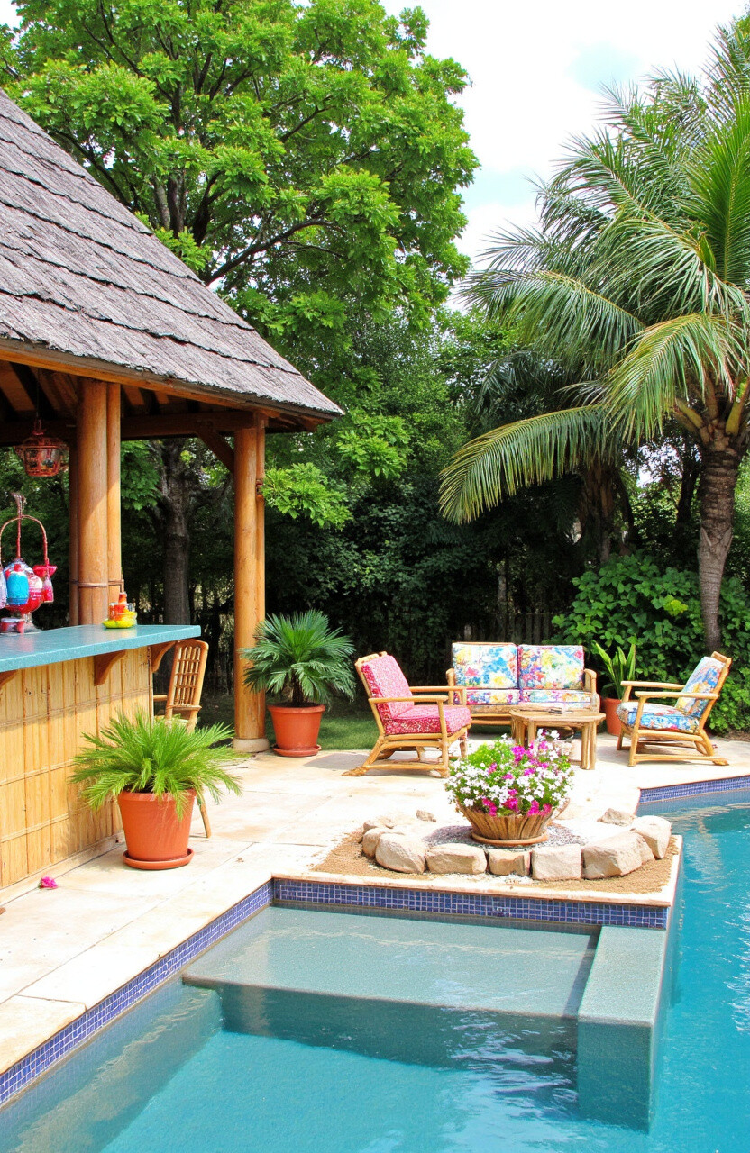 Transform your outdoor space into a tropical paradise with lush greenery and vibrant colors. Large potted plants and colorful cushions can bring an island vibe to your poolside.