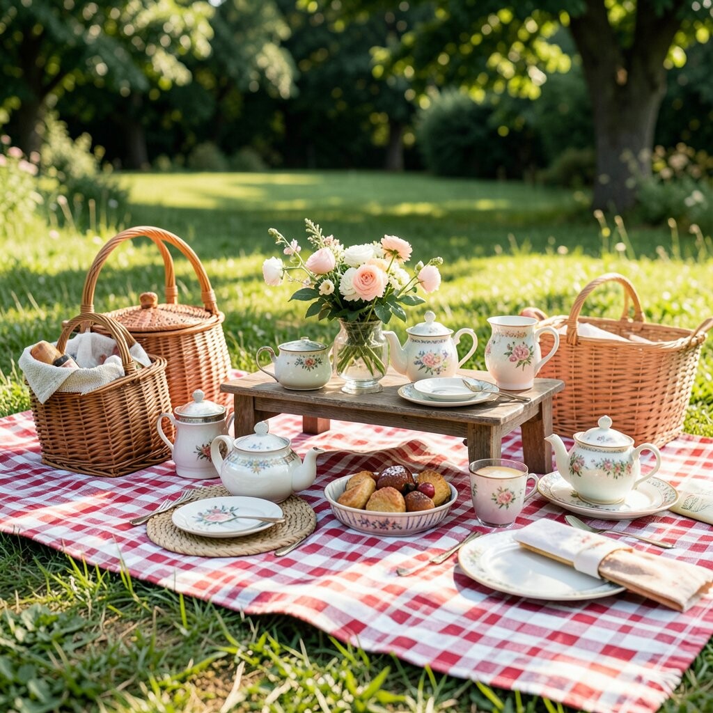 A vintage tea party picnic feels charming and a little fancy. Bring old-style cups, a lace cloth, and pretty plates that make snacks look extra special.