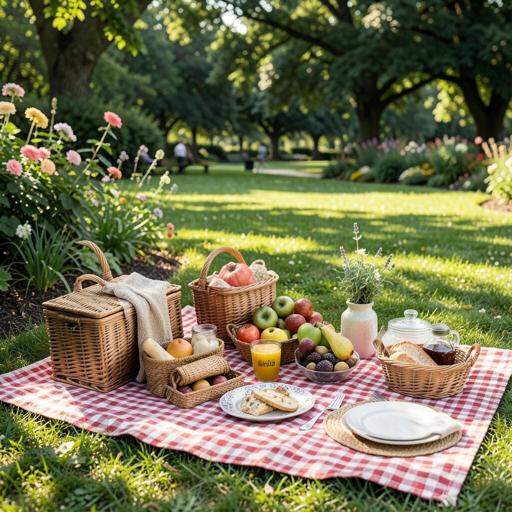 A botanical garden picnic feels elegant and full of color. Sit near flowers and paths with a neat blanket, a pretty basket, and snacks that look as lovely as the setting.