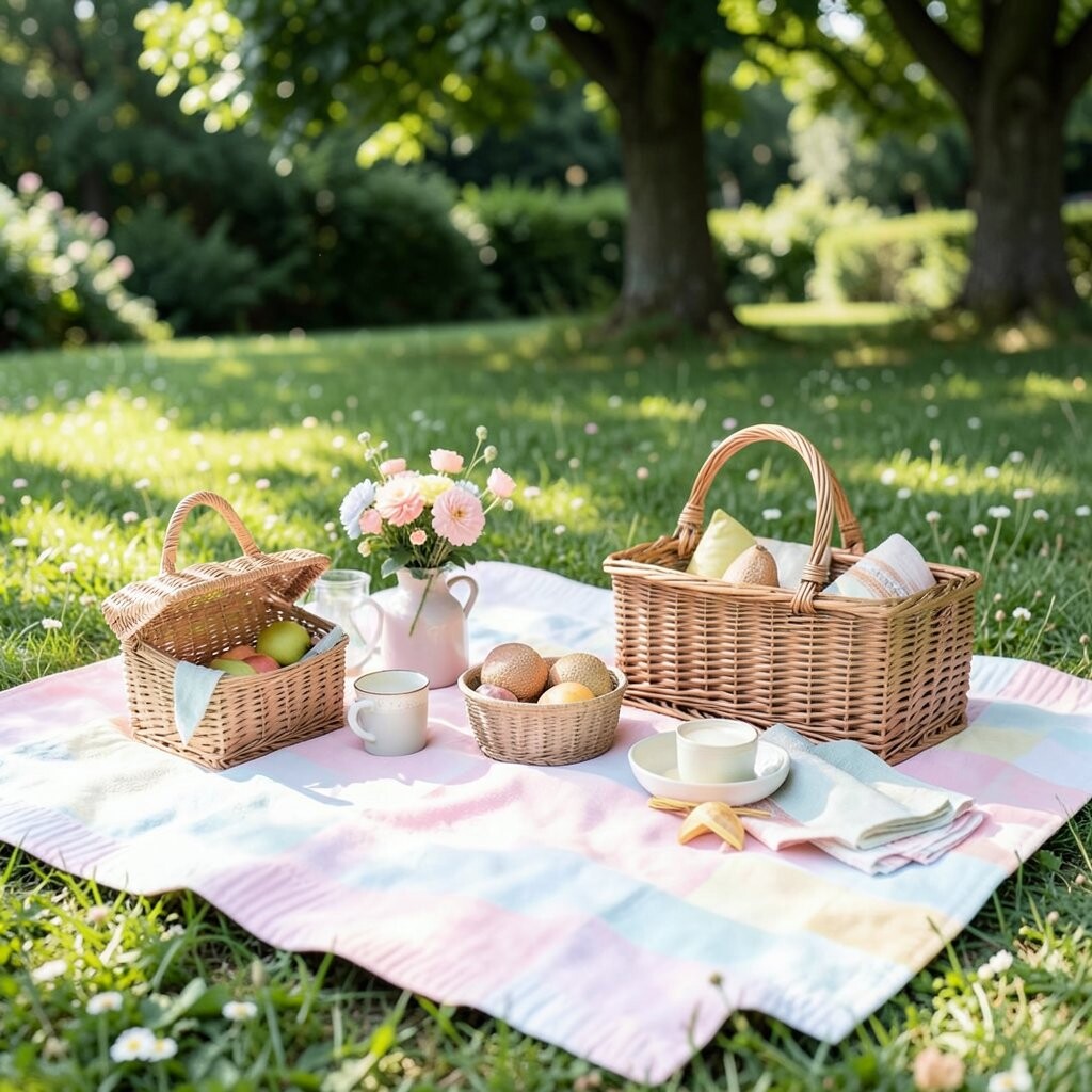 A pastel picnic looks soft, sweet, and very pretty. Use pink, lavender, mint, or baby blue items to make the whole setup feel light and cheerful.