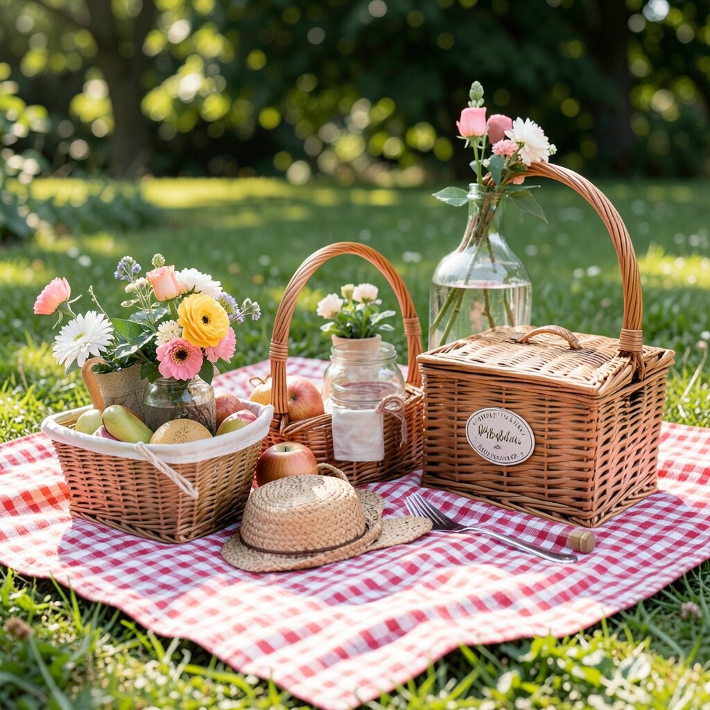 A picnic on a farm or near open fields feels warm and rustic. Use a gingham blanket, a basket with fresh bread, and simple wooden trays for a cute country look.
