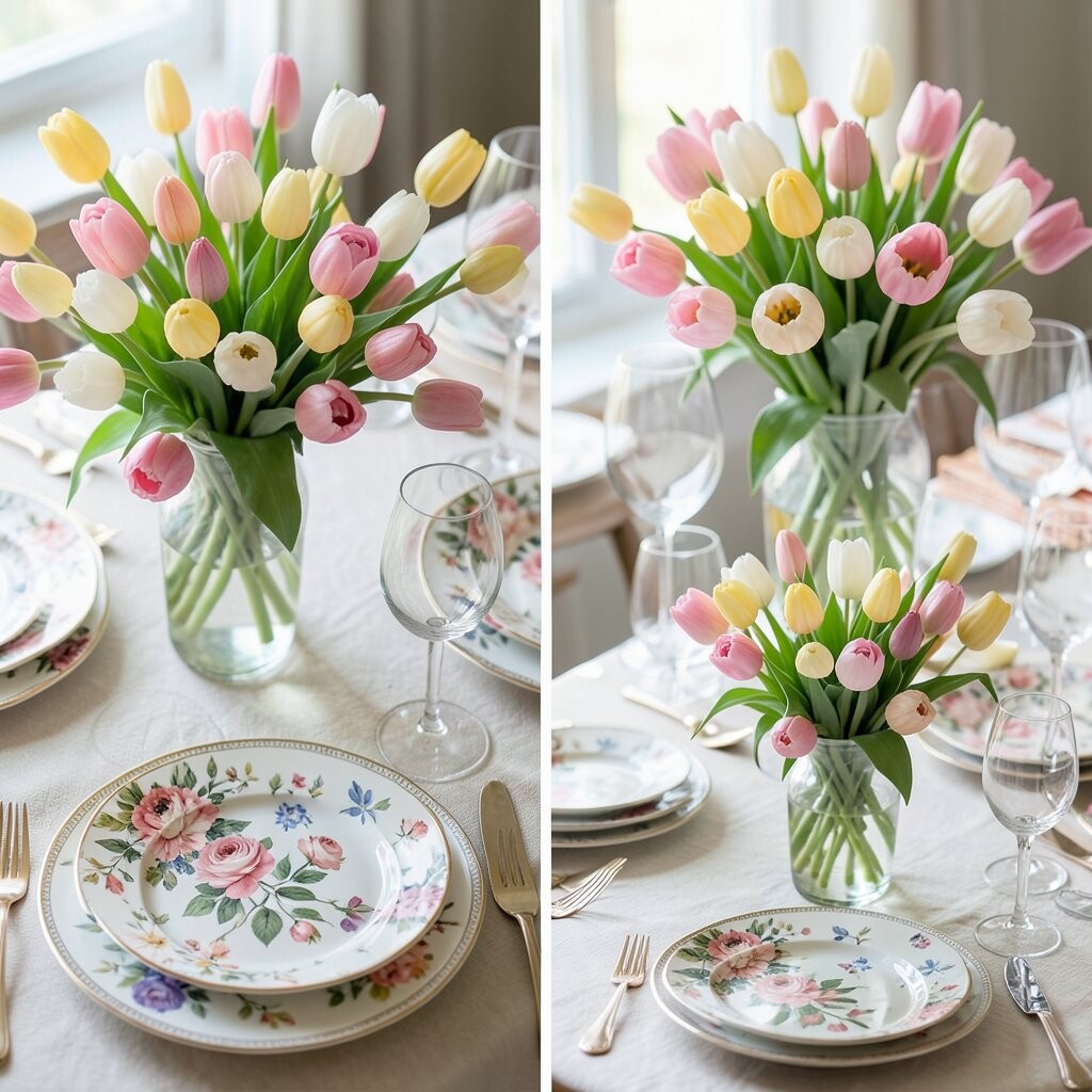 Decorate with tulip bouquets and pastel accessories for a cohesive look. The simplicity and beauty of tulips are sure to charm your guests.