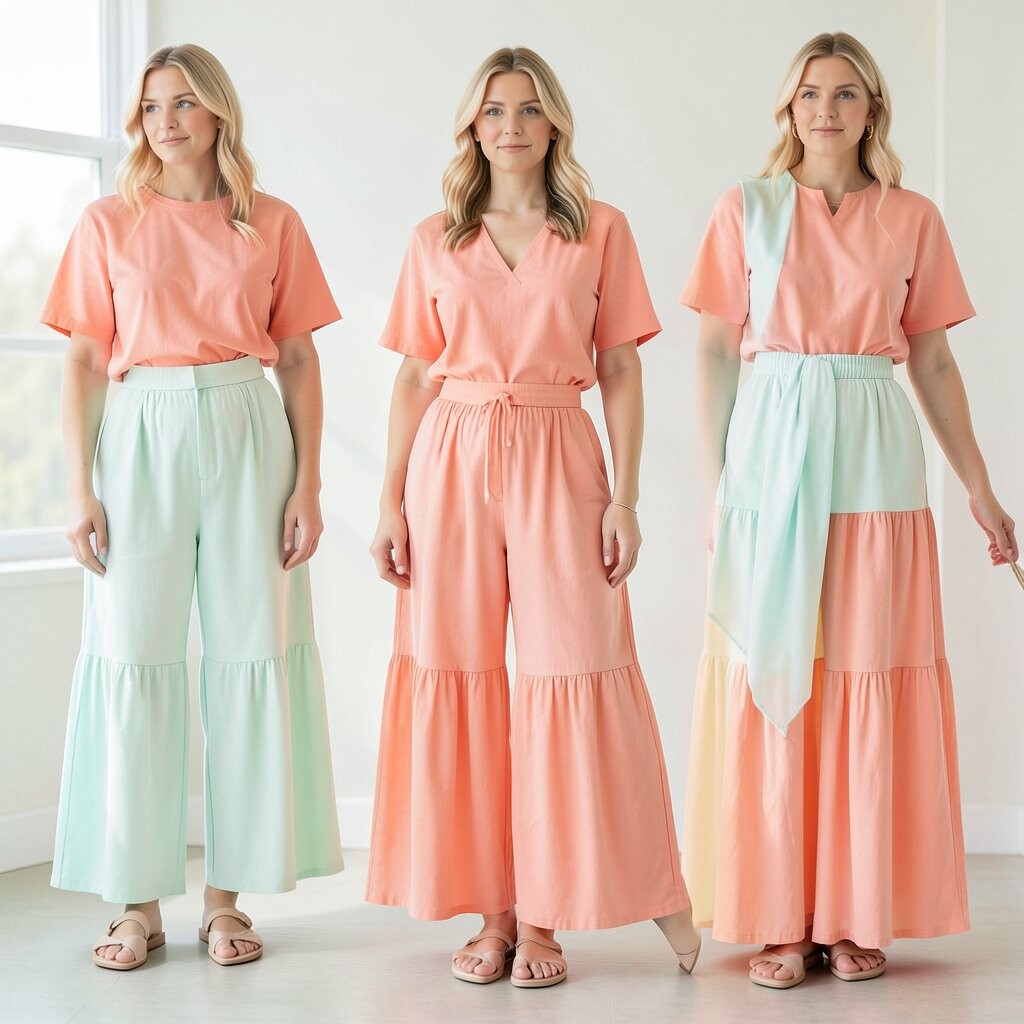 Accessorize with neutral shoes to balance the look. Coral and mint outfits are trendy and available at various price points.