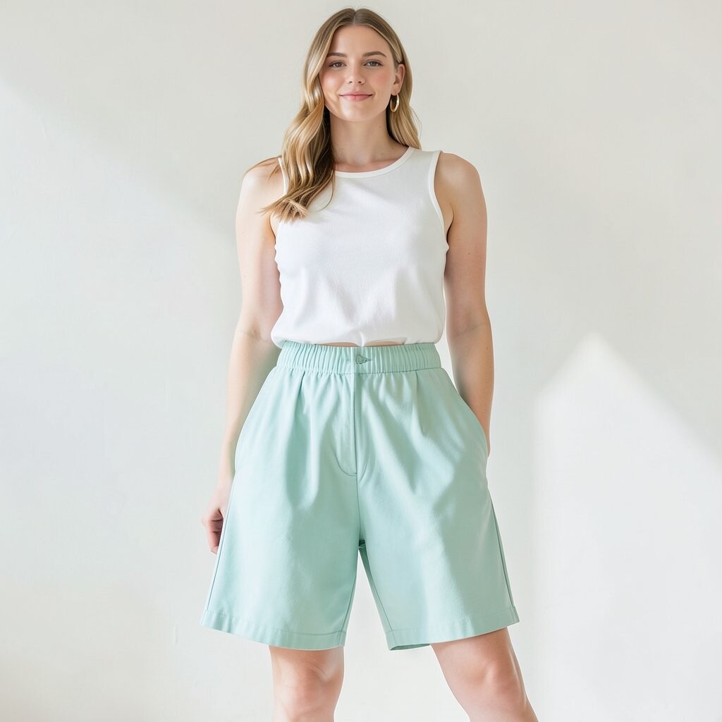 Seafoam green shorts paired with a white top create a refreshing and clean look. It’s like a breath of fresh air.