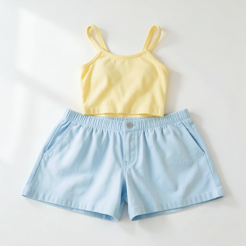 Pastel blue shorts paired with a yellow top are bright and cheerful. It’s like a sunny summer day.