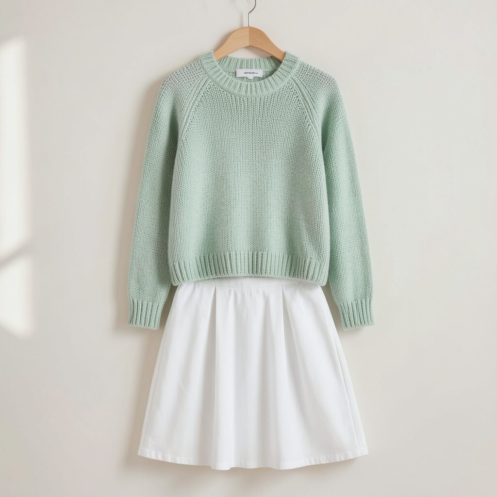 A soft green knit sweater paired with a white skirt is cozy and fresh. It’s like a soft hug on a cool day.