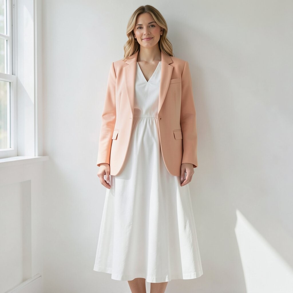 A peach blazer over a white dress is elegant and sophisticated. It’s a classic combination.