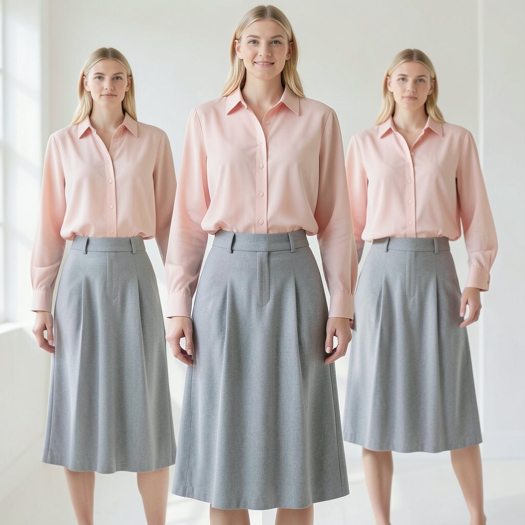 A pale pink blouse paired with a grey skirt is a classic combination. It’s elegant and timeless.