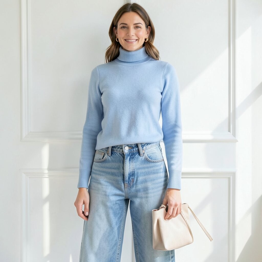 A soft blue turtleneck paired with denim jeans is cozy and stylish. It’s perfect for cooler weather.