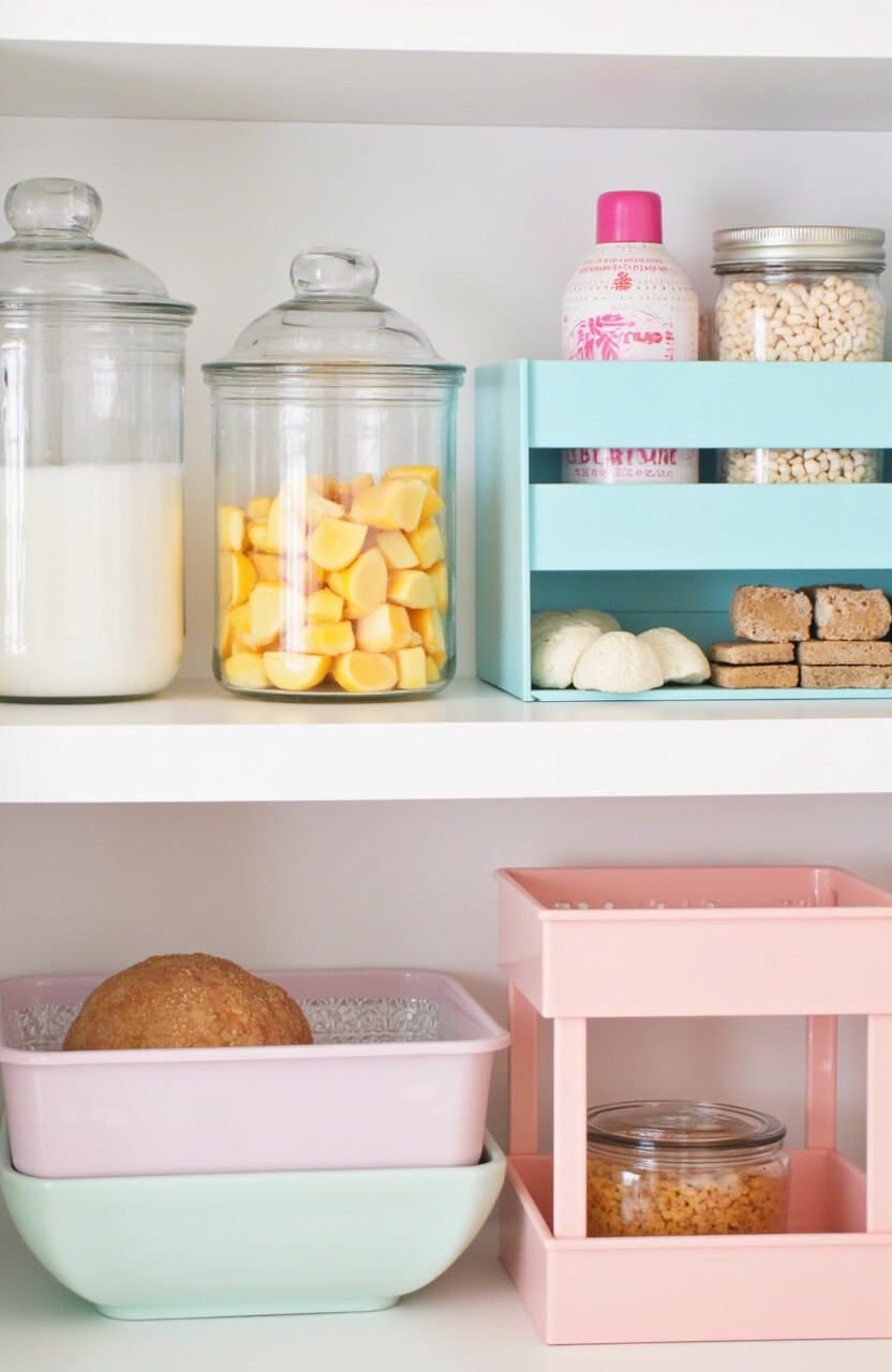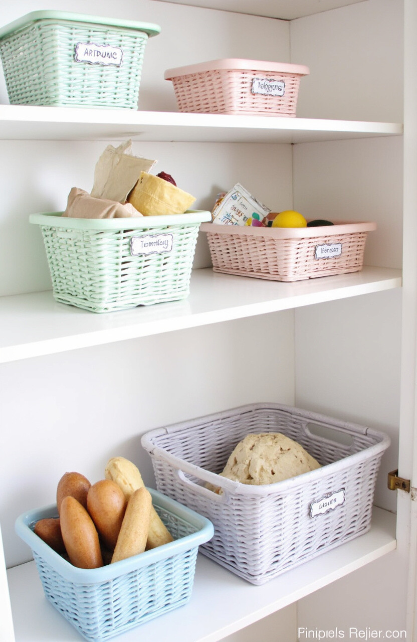 Organize your pantry items into baskets, each in a different pastel color. This method not only looks pretty but also helps categorize items. Choose colors like mint green, blush pink, or baby blue for a soothing effect.