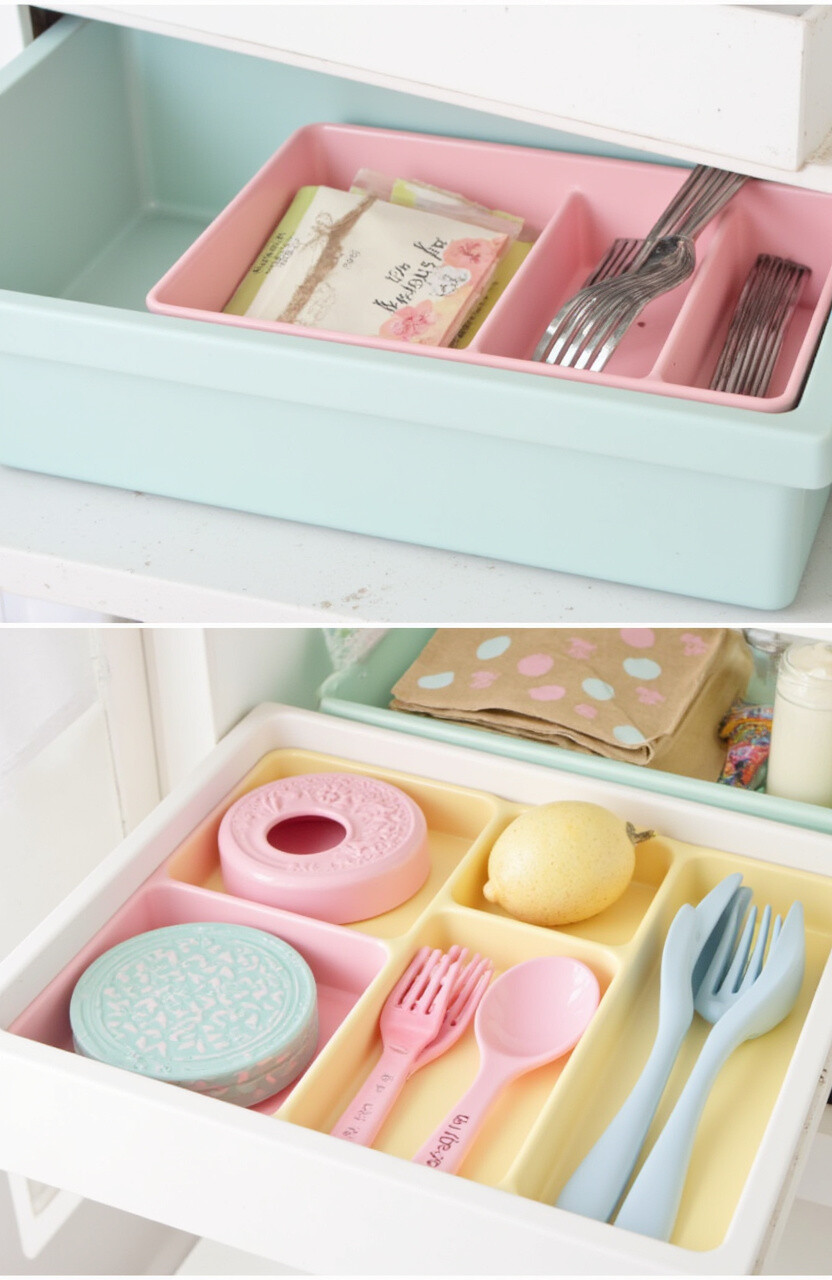 Use pastel-colored drawer organizers to keep utensils and small items in order. They make finding what you need quick and easy. Pastel colors add a cheerful touch to your pantry.