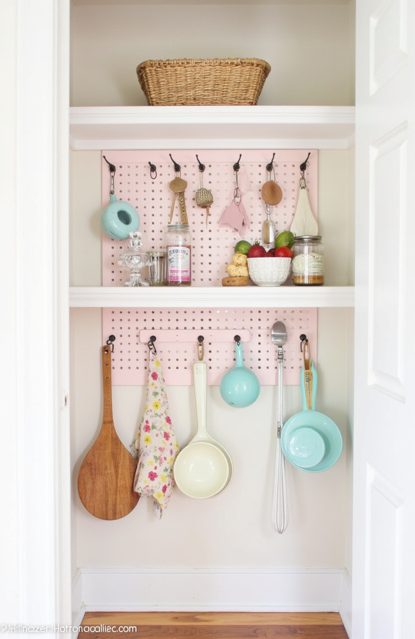 Install a pegboard on a pantry wall and paint it in your favorite pastel shade. Use hooks to hang utensils, measuring cups, and more. This keeps items off the shelves and within easy reach.