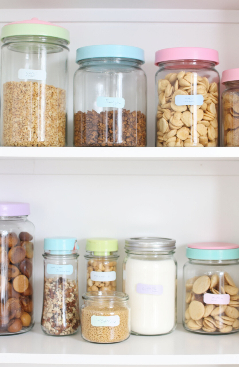 Use glass jars with pastel-colored lids to store everything from grains to snacks. These jars allow you to see everything at a glance, making it easier to find what you need. The pastel lids add a pop of color and charm.