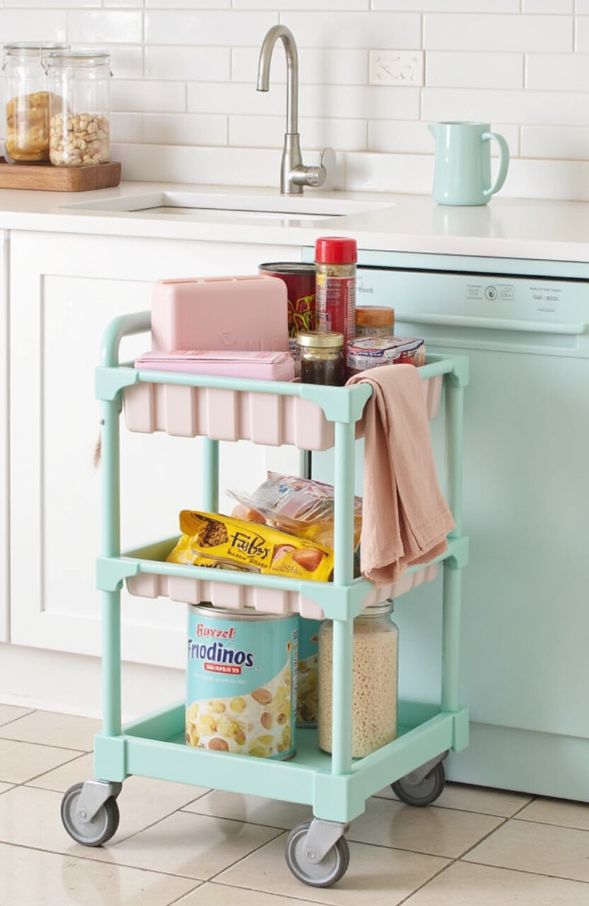 Add a pastel-colored rolling cart to your pantry for extra storage. It’s perfect for holding snacks, canned goods, or kitchen gadgets. The wheels make it easy to move around.