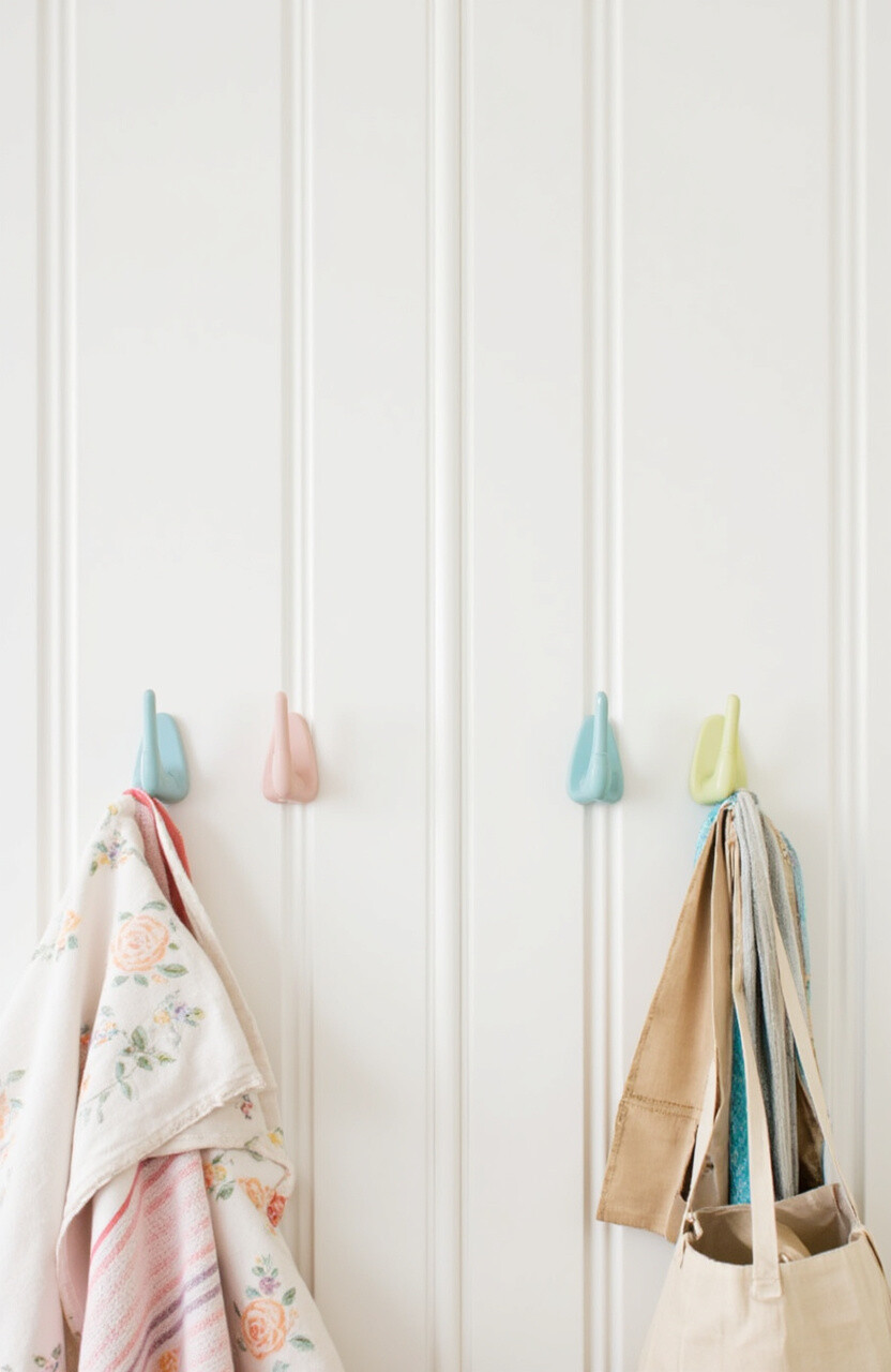 Install pastel-colored hooks on the inside of pantry doors. Use them to hang aprons, towels, or bags. They keep items off the floor and within easy reach.