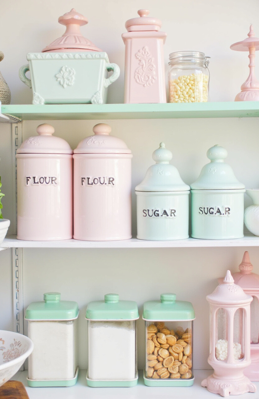 Mix and match different pastel shades for a unique look. Vintage canisters can be found at thrift stores or online, making this a cost-effective idea. They add an element of nostalgia to your pantry.