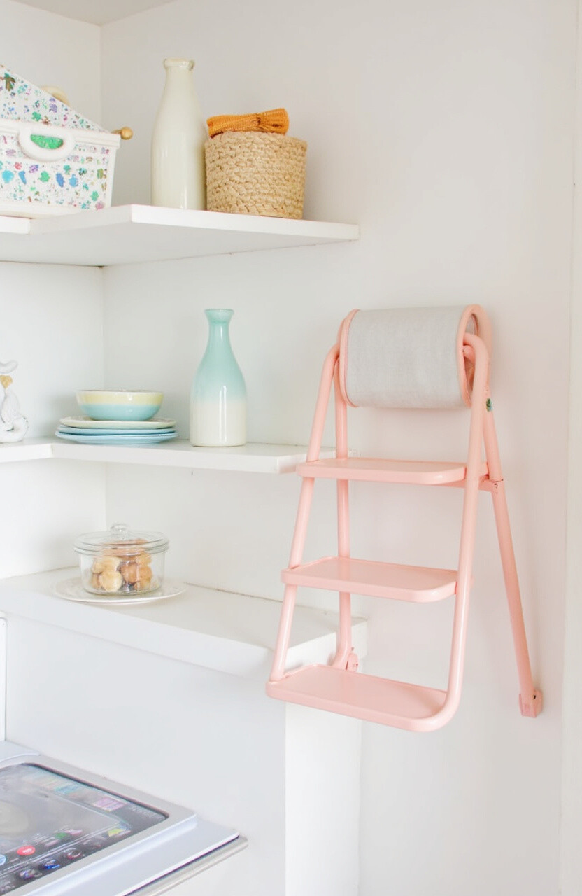 Add a small pastel-colored ladder to your pantry for reaching high shelves. It’s a practical tool that doubles as decor. Choose a foldable design for easy storage.