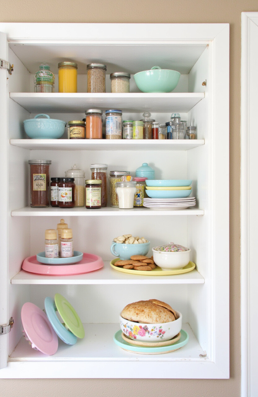 Place pastel-colored lazy Susans in your pantry for easy access to items. They’re perfect for organizing spices, sauces, and jars. The rotating feature makes everything reachable.