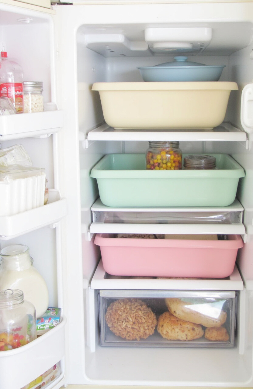 Use pastel-colored bins in your fridge to organize food items. They make it easy to find what you need and keep things tidy. The pastel colors add a cheerful touch to your fridge.