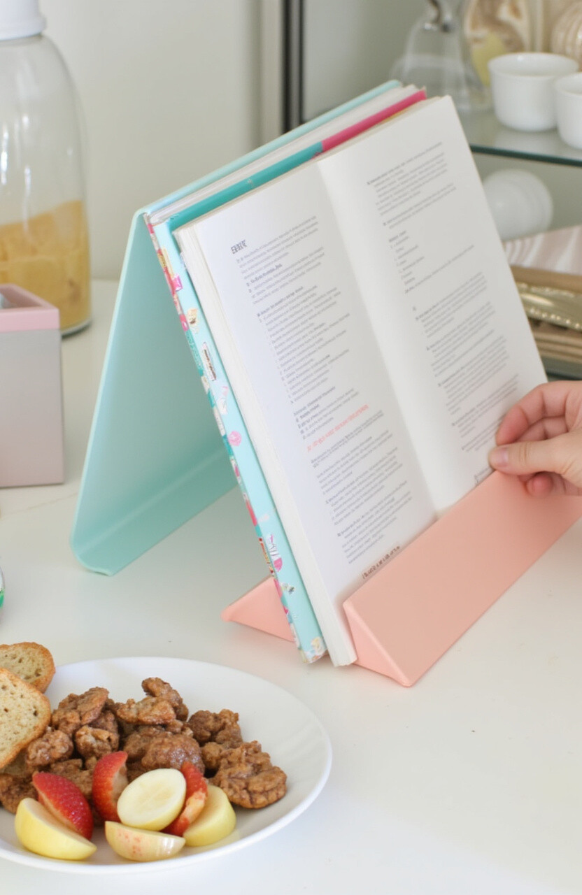 Use a pastel-colored cookbook stand to hold your favorite recipes. It keeps your cookbook open and accessible while cooking. The pastel shade adds a cheerful touch.