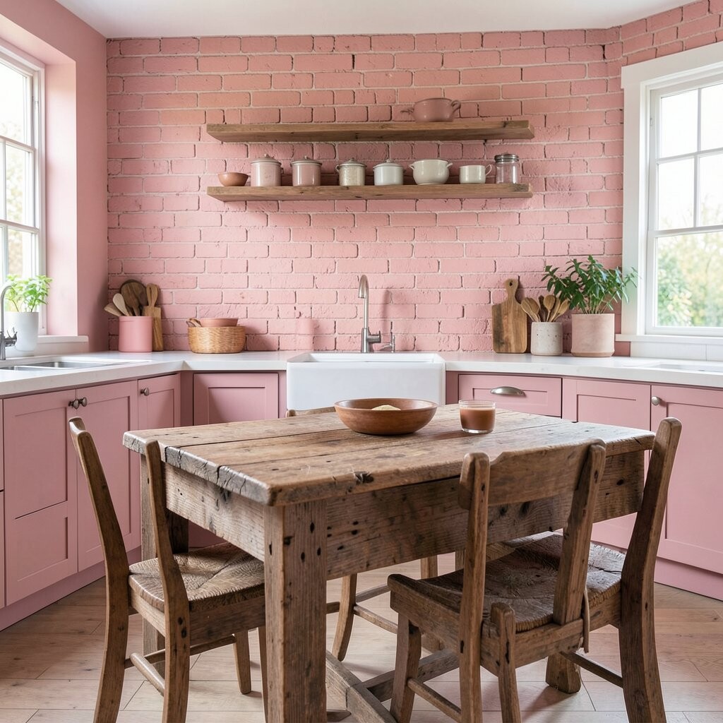 A pink-painted brick wall can bring so much warmth and texture to a kitchen. Pair it with a rustic wood table, and the room feels grounded, cozy, and full of charm.