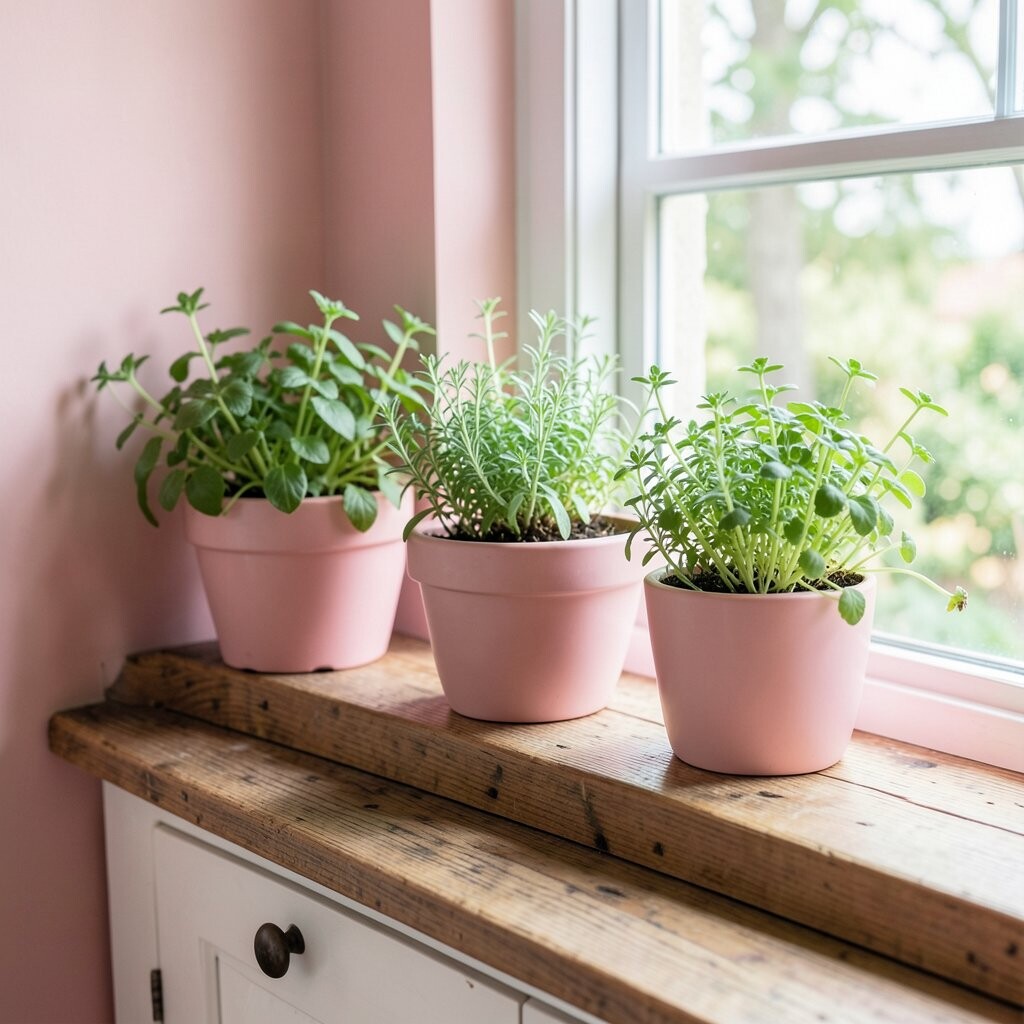 Pink herb pots on a wooden windowsill can make the kitchen feel alive and sweet. Tiny green plants in blush containers create a fresh look that fits rustic style so well.