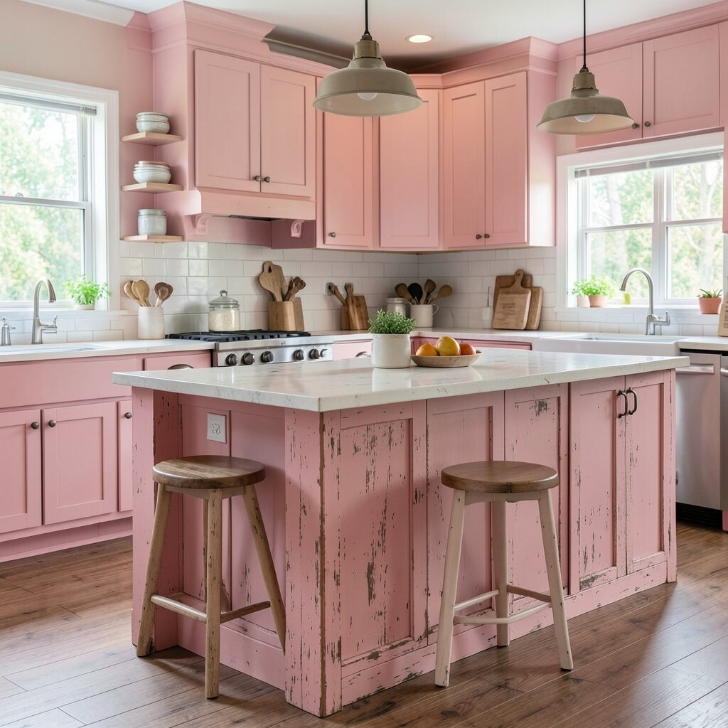 A pink kitchen island with a distressed finish can become the star of the room. The worn edges and soft color make it feel like a treasured old piece with a sweet new life.