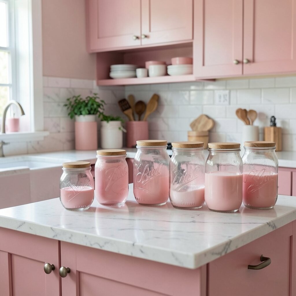 Pink mason jars are a cute way to store dry goods, utensils, or flowers. Add wooden lids or bamboo tops, and the jars fit right into a rustic kitchen with charm.