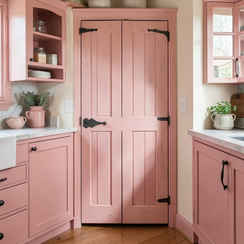 A pink pantry door can be such a happy surprise in a kitchen. Add iron handles or a dark latch, and the look becomes rustic, bold, and a little bit dramatic.