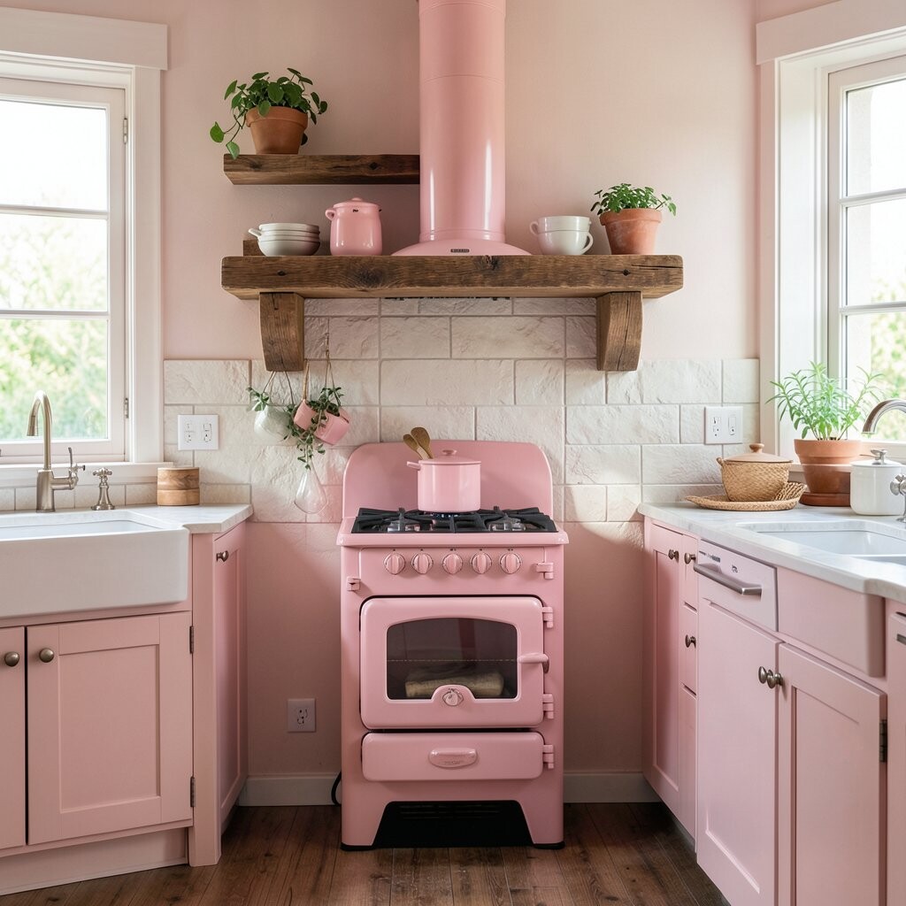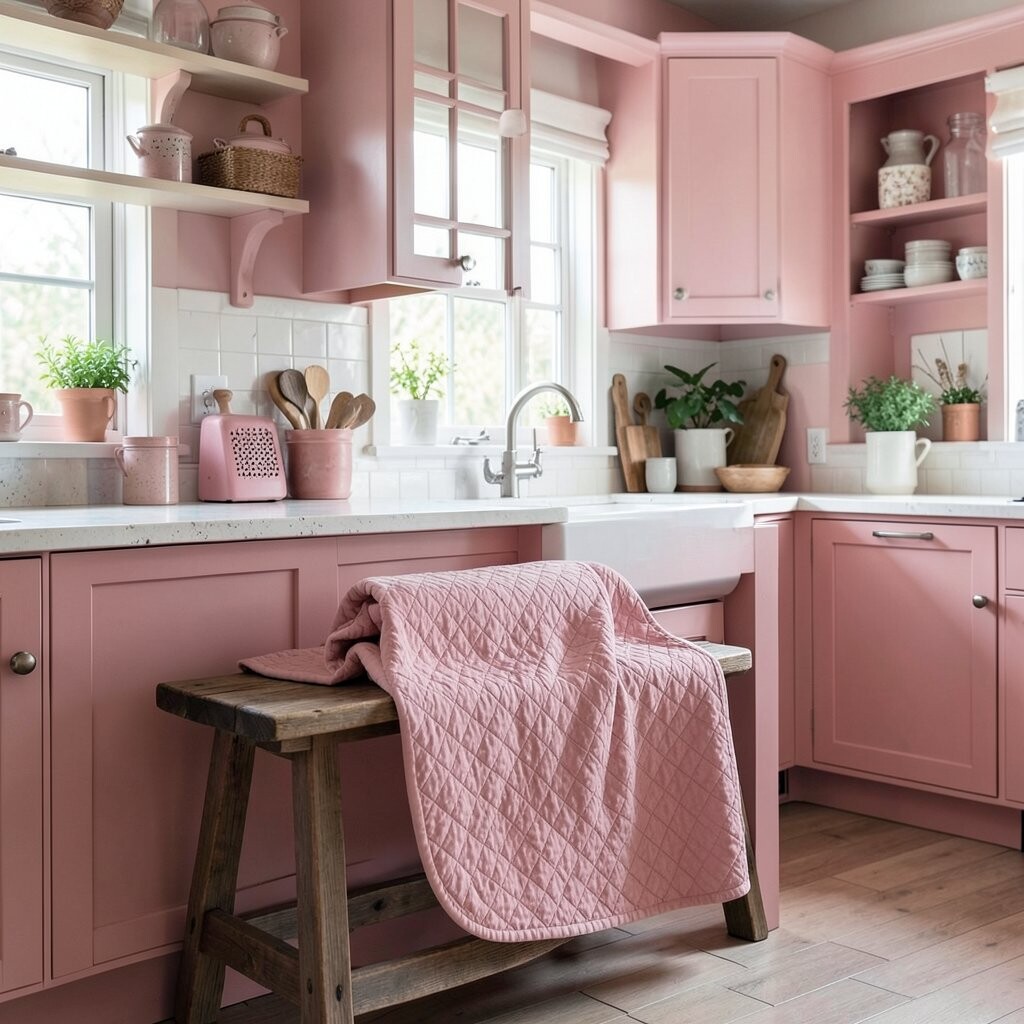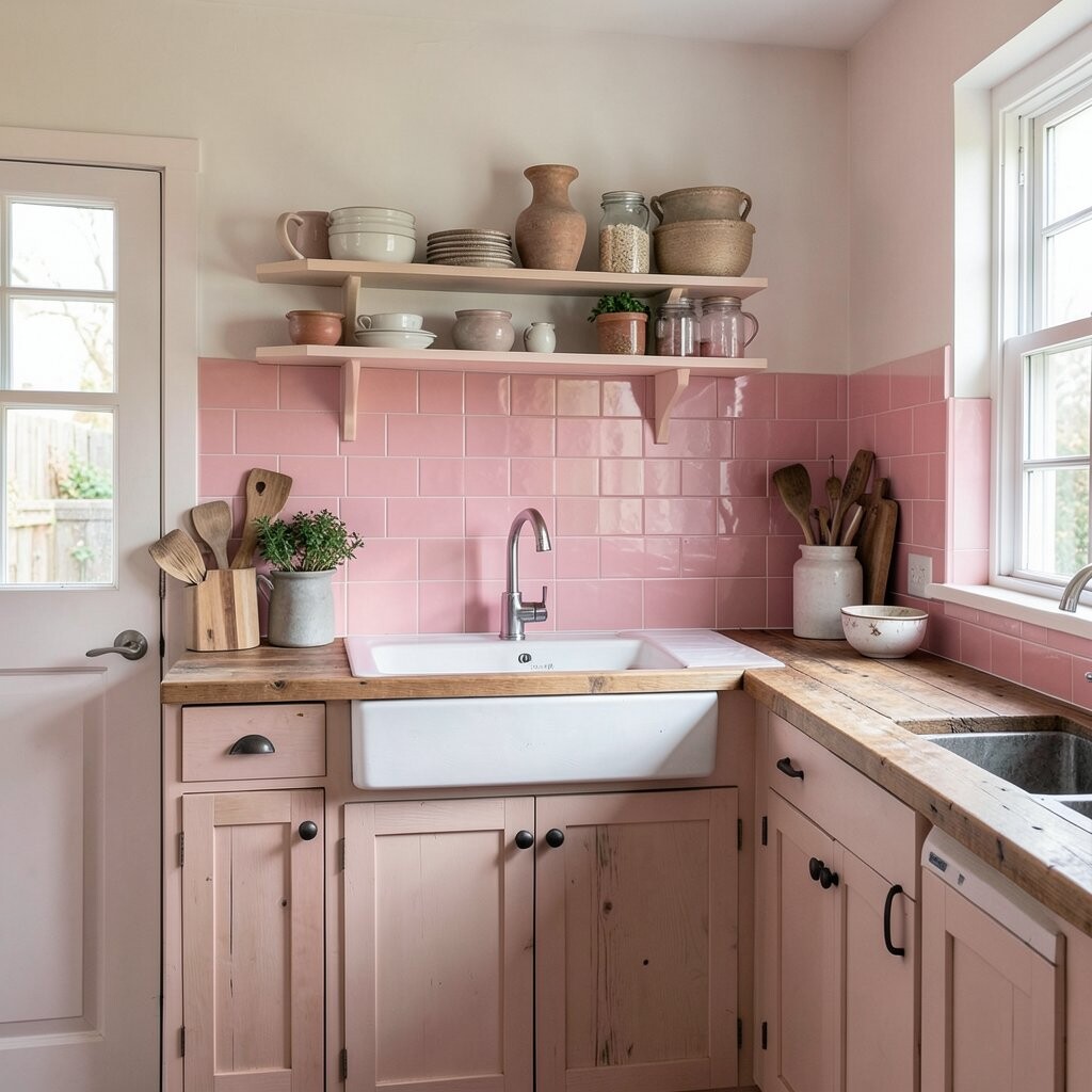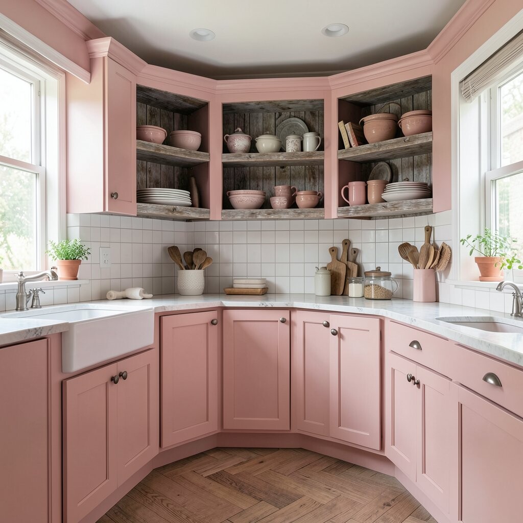 Soft pink cabinets can bring a gentle glow to a rustic kitchen, while weathered wood shelves keep the room feeling earthy and real. The mix feels fresh but still cozy, like a pretty farmhouse with a sweet twist.