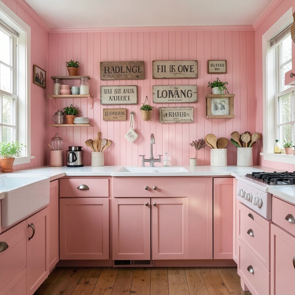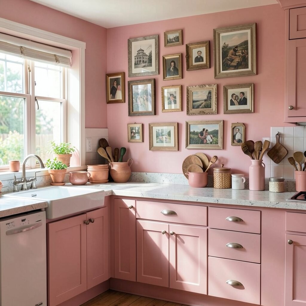 A pink rustic gallery wall can make a kitchen feel cheerful and full of life. Mix framed art, old recipe cards, wooden signs, and soft pink prints for a look that feels collected and warm.