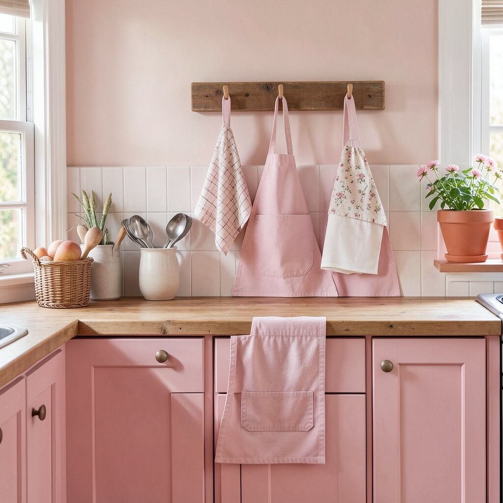 Pink aprons and tea towels can make the kitchen feel sweet before you even start cooking. Hang them on wooden pegs, and they become part of the rustic decor instead of being hidden away.