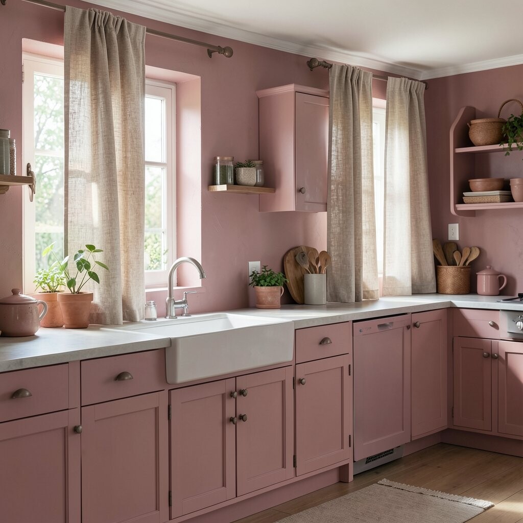 Dusty pink walls can wrap a kitchen in a soft, cozy feeling that is easy on the eyes. Add natural linen curtains, and the room gets a rustic touch that feels calm and airy.