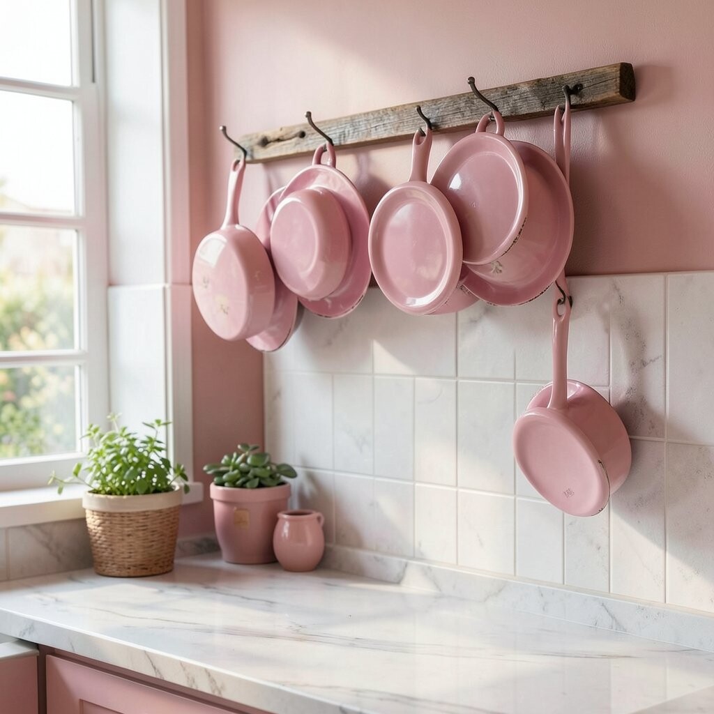 Pink enamelware hanging on rustic hooks can make a kitchen wall feel charming and old-fashioned. Bowls, mugs, and pitchers in soft pink look sweet against wood or brick.