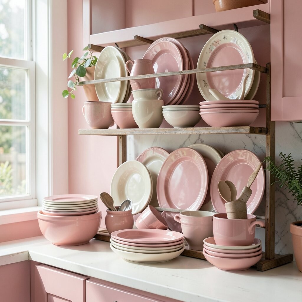 Pink and cream dishware can look so pretty when it is stacked on rustic plate racks. The soft colors make the kitchen feel calm, while the wood rack adds that old-country charm.