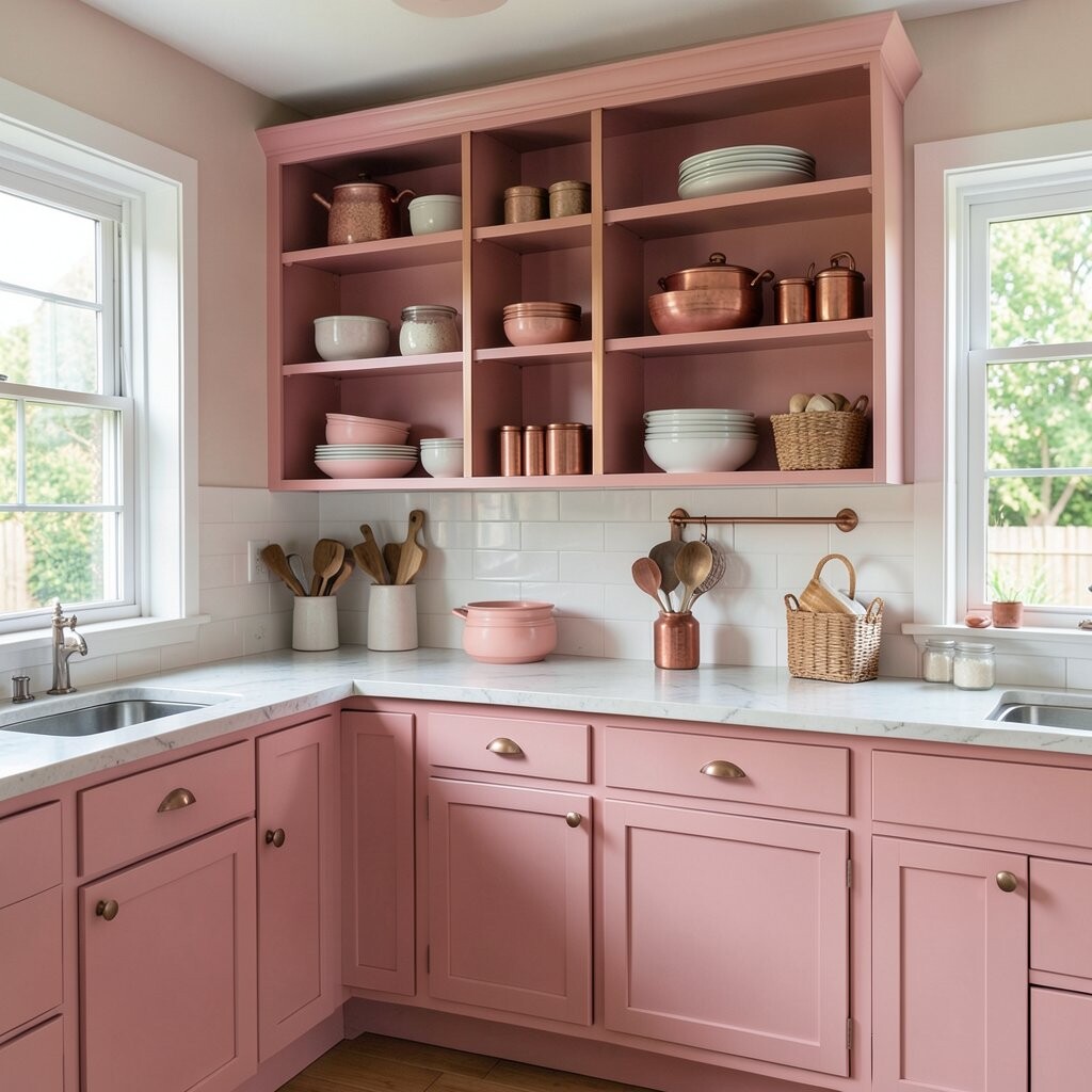 Pink open shelves can make plain walls feel playful and pretty. Add copper mugs, pans, or little bowls, and the whole kitchen starts to glow with warm rustic charm.