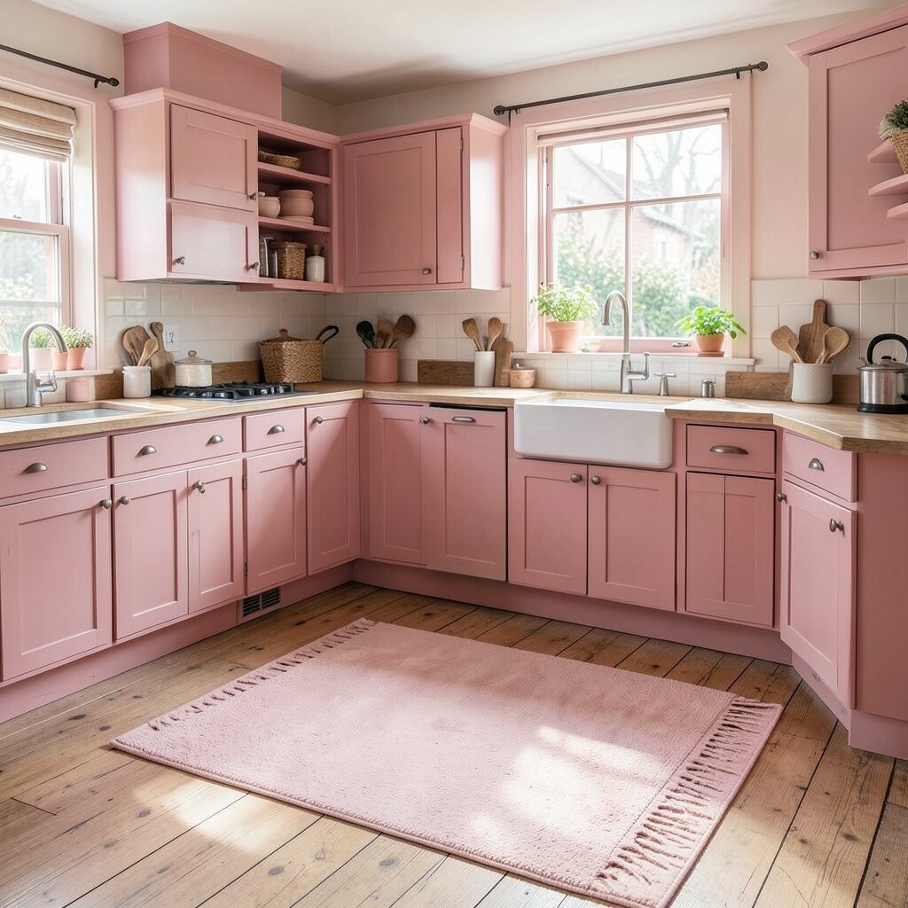 A soft pink rug can warm up wide plank floors and make the kitchen feel more inviting. The rustic wood underfoot and the gentle pink above create a cozy, balanced look.