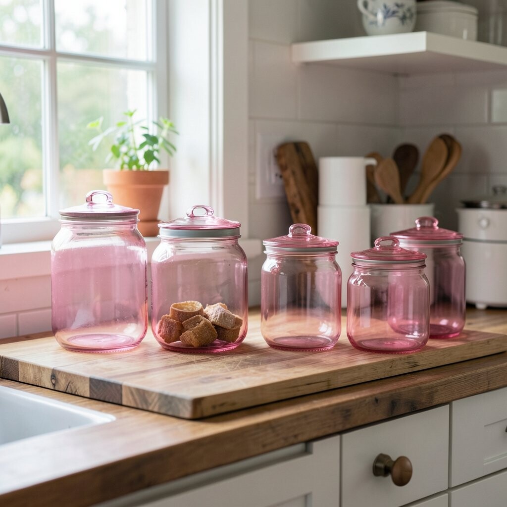 Pink glass canisters can sparkle softly on a butcher block counter. The clear glass and warm wood make a rustic pairing that feels neat, pretty, and useful.