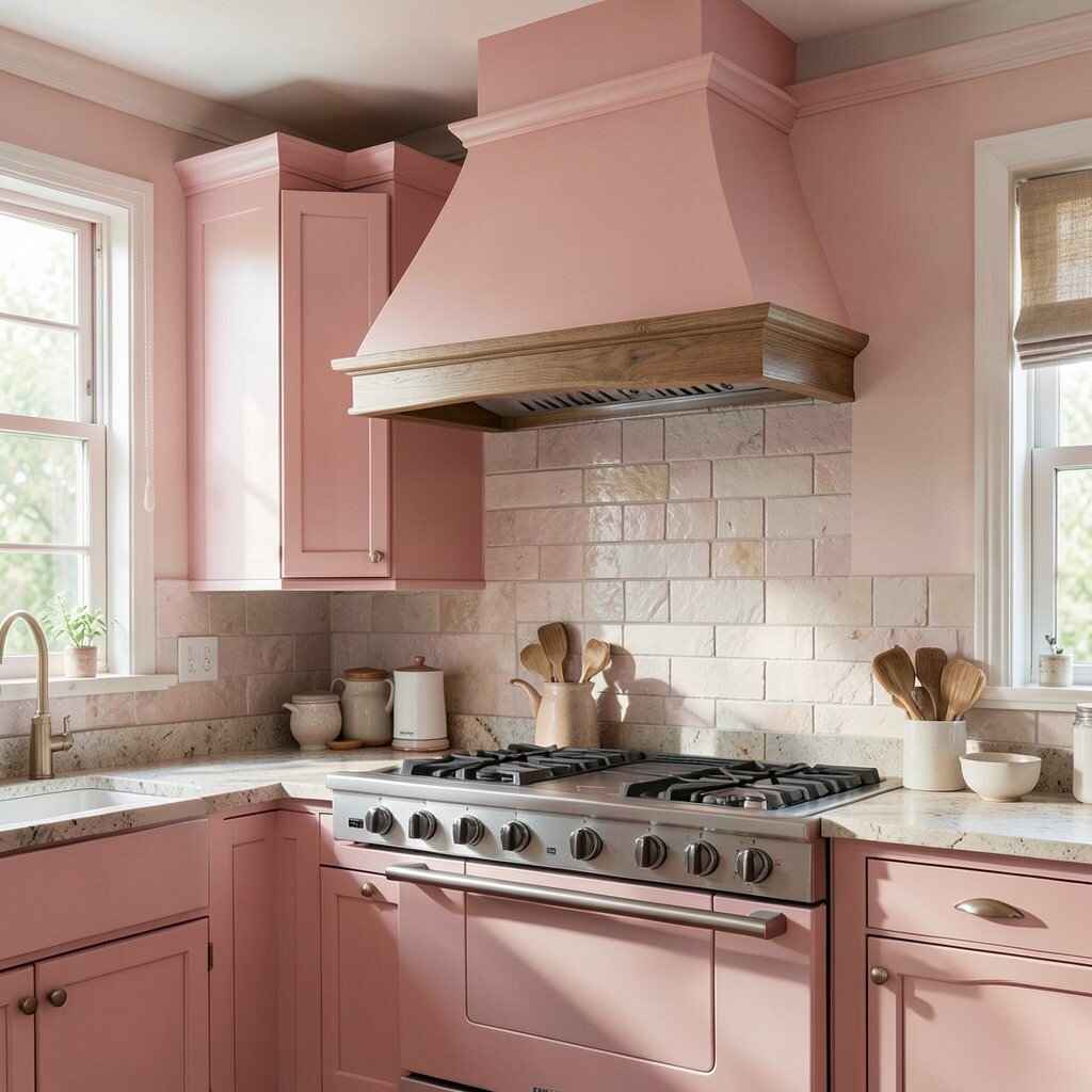A blush pink range hood can make the cooking area feel soft and stylish. Add wood trim around it, and the rustic feel gets stronger and more natural.