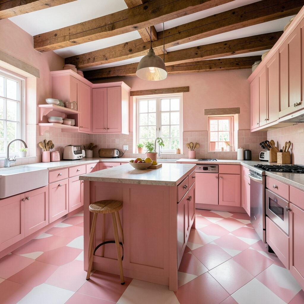 A pink and white checker floor can make the kitchen feel fun, bright, and a little bit retro. When you add wood beams above, the rustic style grounds the whole room and keeps it from feeling too sweet.