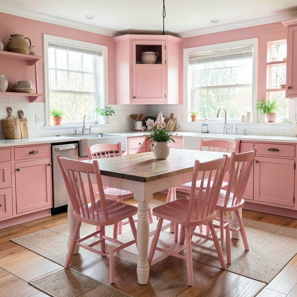A big farmhouse table feels even sweeter when it is paired with pink painted chairs. The old wood table gives the room a rustic heart, and the pink chairs bring in a happy, friendly mood.