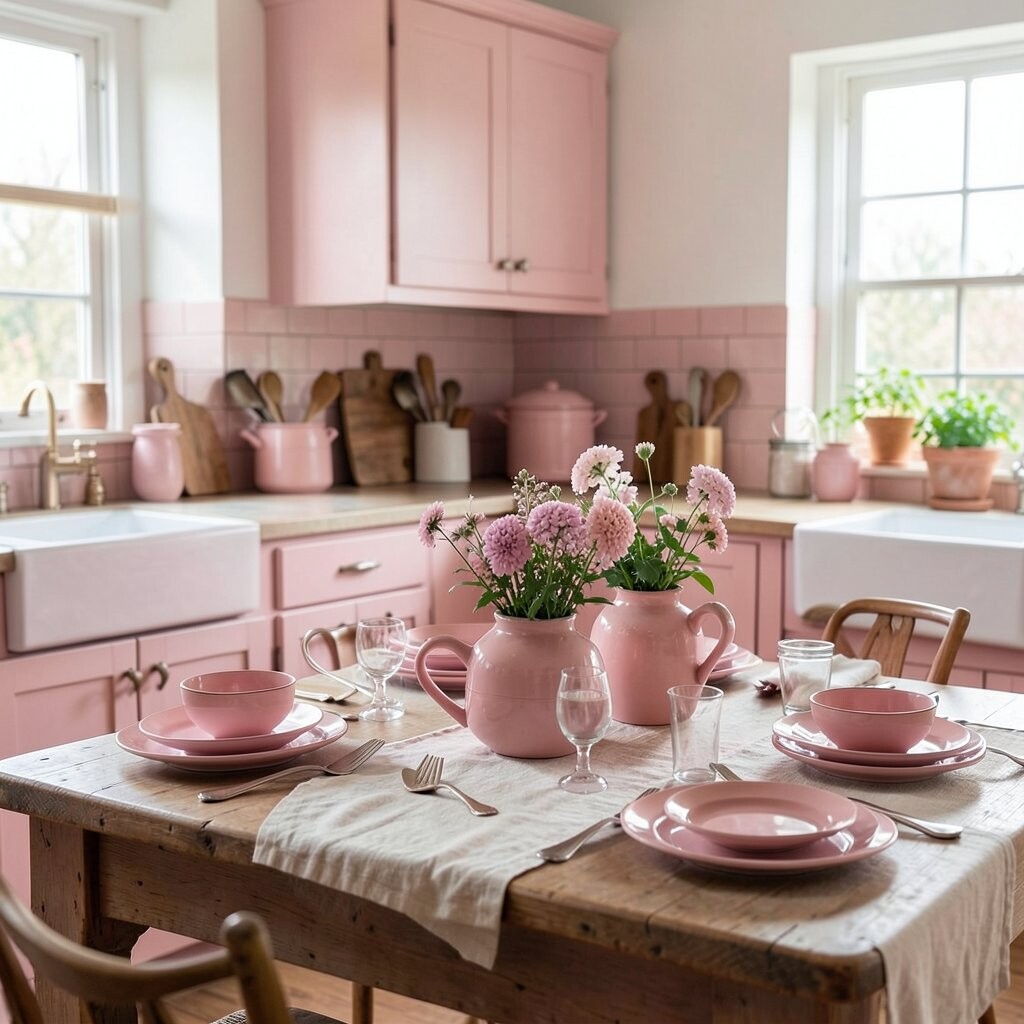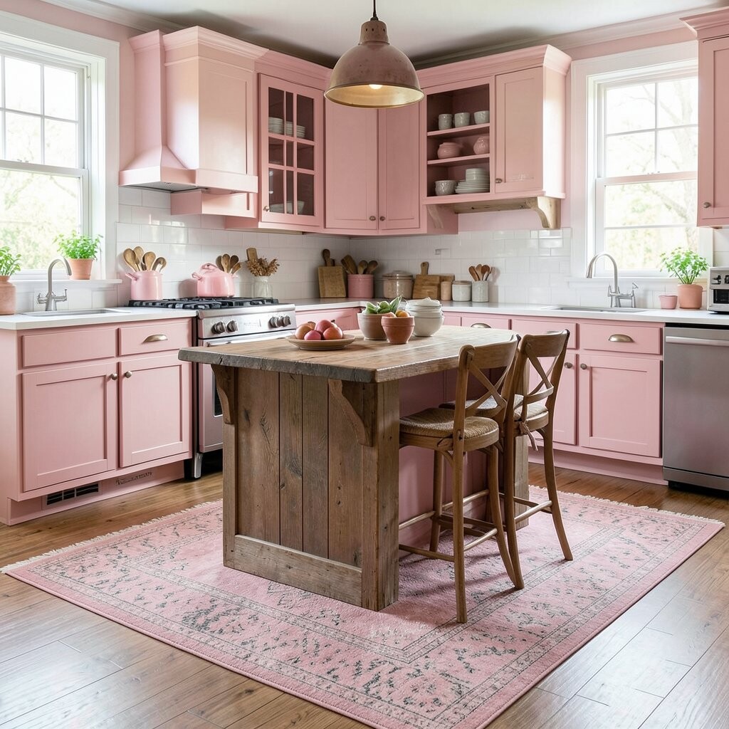 A pink rustic rug can add warmth and texture to your kitchen floor. It’s a cozy addition that can make the space feel more inviting. Look for patterns that blend pink with earthy tones for a balanced look.