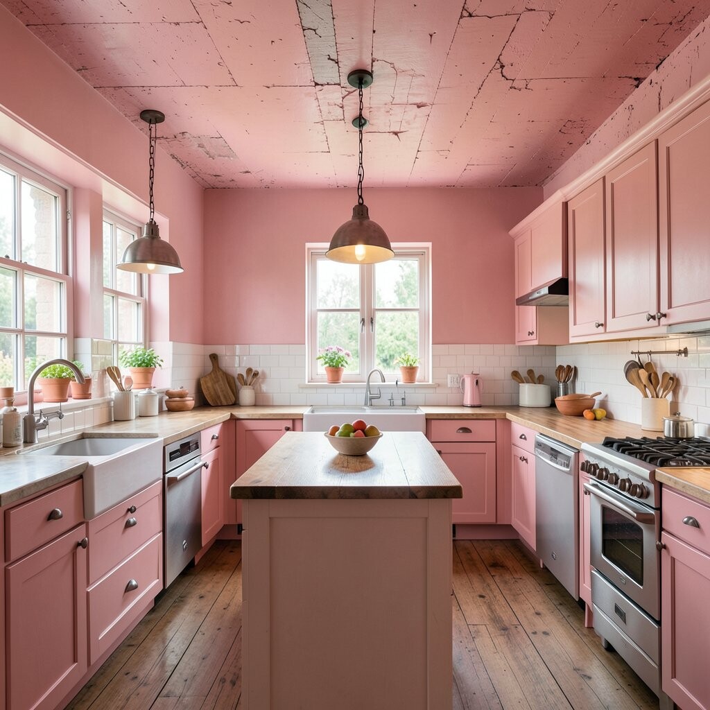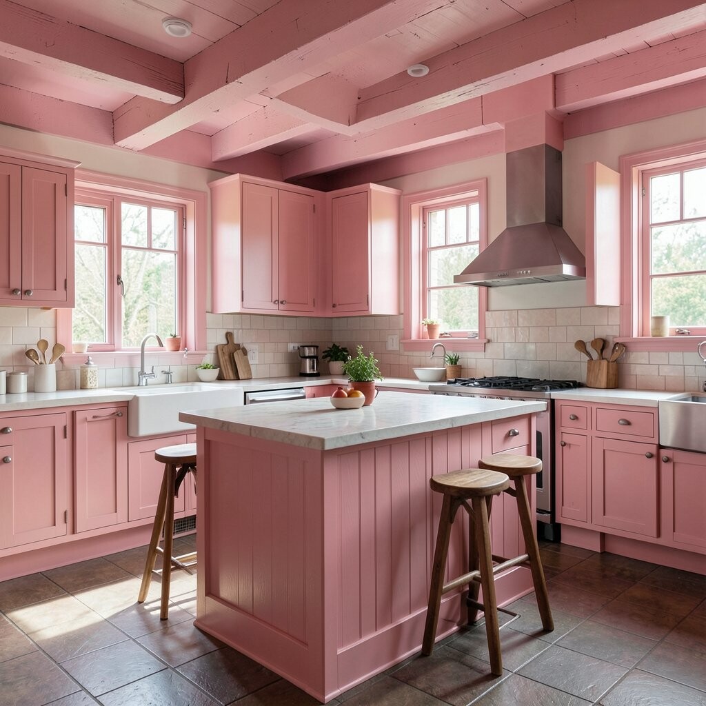 If your kitchen has exposed beams, painting them pink can be a bold statement. It’s a fun way to contrast with natural wood elements. The beams become a focal point, drawing eyes upward and adding height to the room.