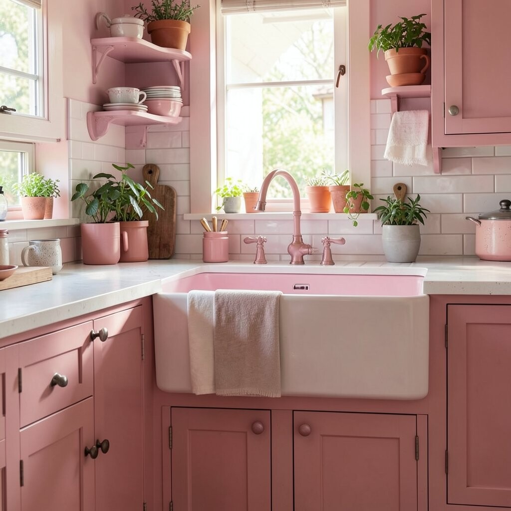 A farmhouse sink with pink accents is both practical and pretty. The large, deep basin is ideal for busy kitchens, while the pink details add a pop of color. It’s a lovely way to incorporate pink without overdoing it.