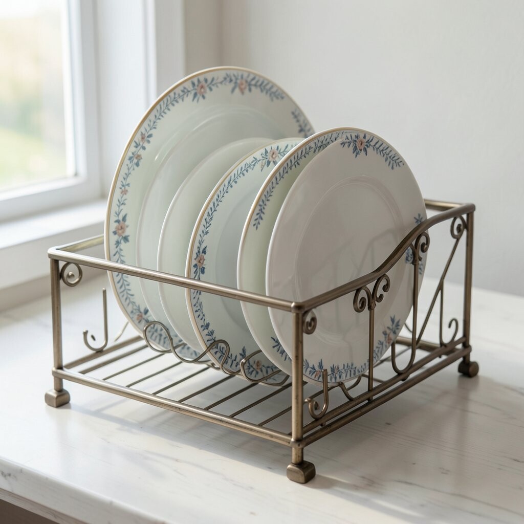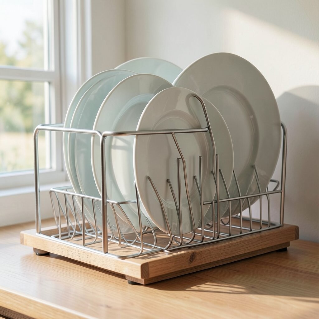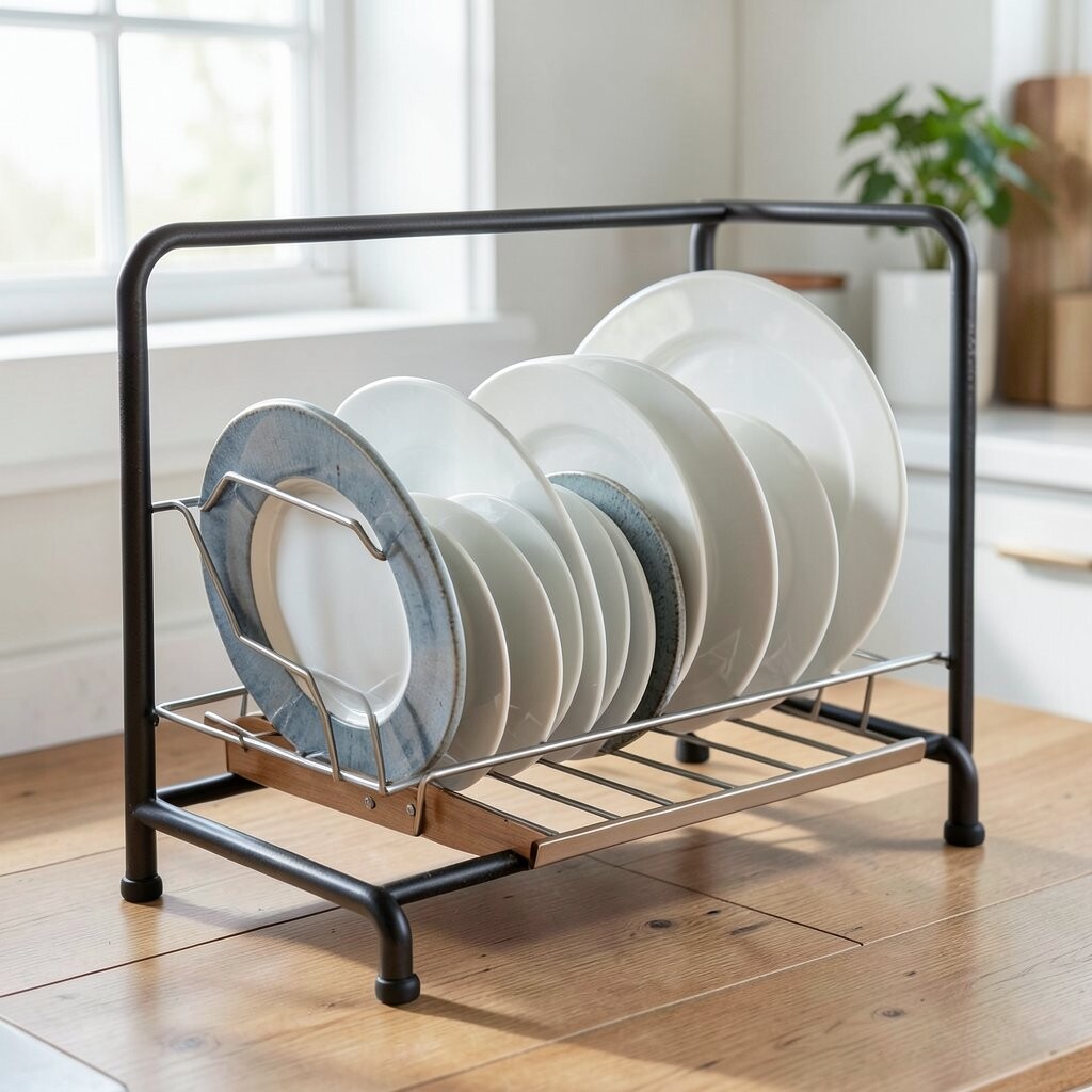 A metal plate rack gives a clean and sharp look. It feels cool, simple, and just right for a modern home.
