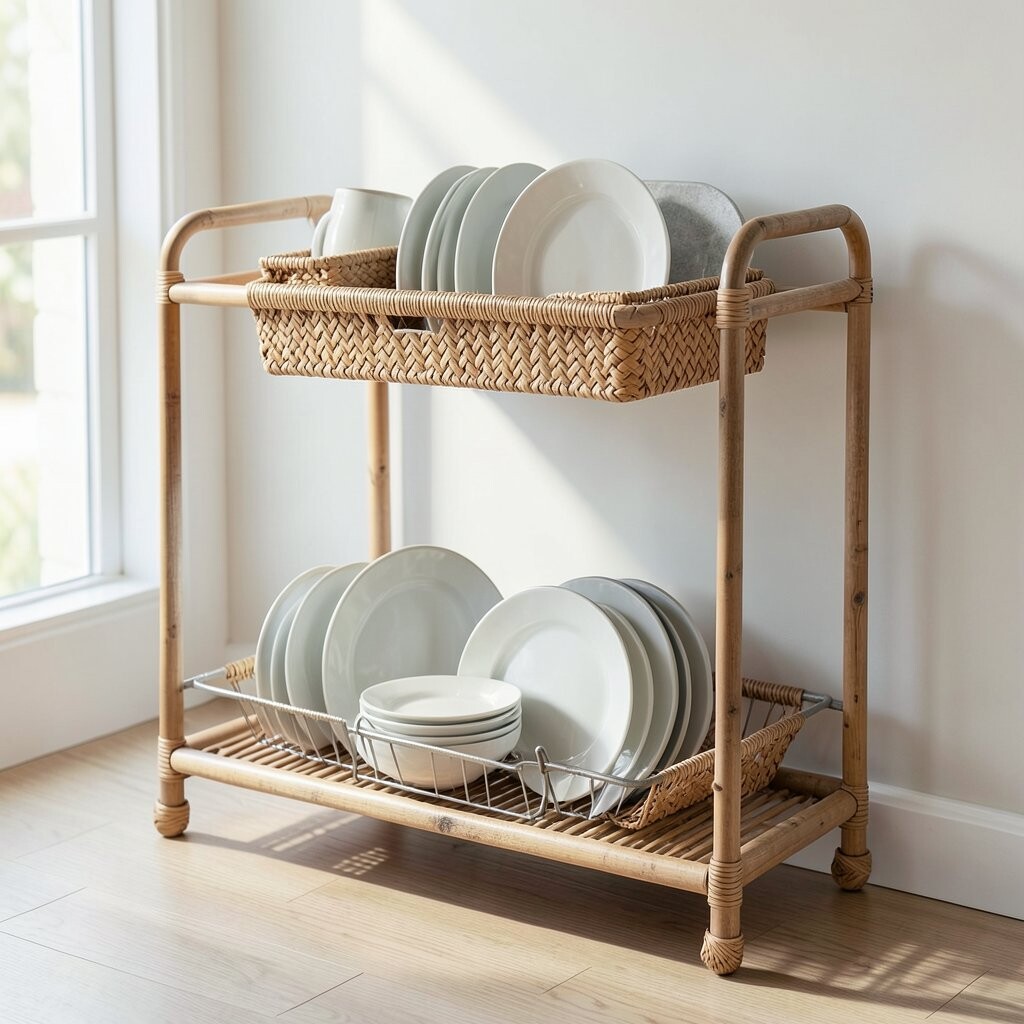Woven accents bring a soft, natural touch to a plate rack. Think cane, rattan, or wicker details that make the piece feel warm and sweet.